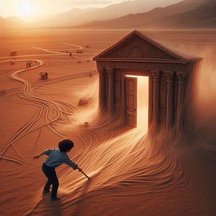 A small child draws a door in the dusty desert plain with a stick. As they turn away, the drawing becomes a real door and slowly, it begins to open.