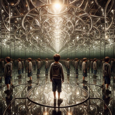 A boy steps into a carnival mirror maze, but the faces staring back at him from behind the glass aren’t his own, they belong to strangers.